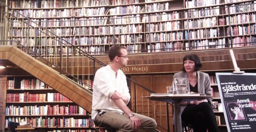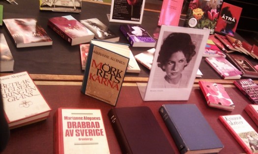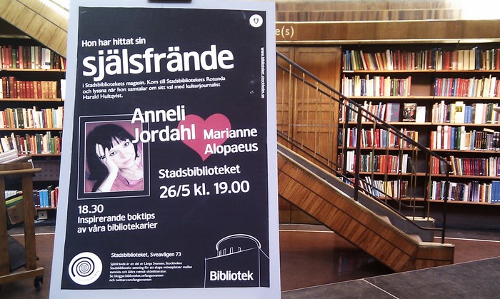 I kväll var sista programmet för säsongen i Stadsbibliotekets Själsfrände-serie. Anneli Jordahl hade valt finlandssvenska författaren Marianne Alopaeus, som jag aldrig hört talas om, och skulle berätta om hennes författarskap, och förband var tre av mina bibliotekariekolleger som skulle tipsa om helt andra böcker. Jag tog en bra plats och bläddrade lite i den enda Anneli Jordahl-bok jag läst, Klass – är du fin nog?, men blev anmodad av kollegan Annika att komma upp och förmingla i lunchrummet (det har under dagen varit en konferens som bland annat handlat om den här typen av program, och konferensdeltagarna bjöds på förfriskningar). Jag protesterade att boktipsen ju skulle börja om fem minuter, men enligt Annika förminglade även boktipsarna.