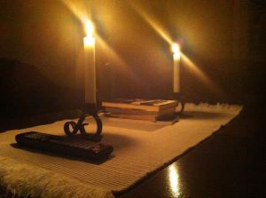 Kvällens hemgruppssamling ägde rum hos Joakim i Älvsjö. ”Onsdagsmys at my place” var Joakims rubrik till den här Facebook-uppladdade bilden, och det ser ut som att han satt och myste helt för sig själv, men vi andra satt faktiskt där kring ljusen. Fika, en runda då vi kort delar det viktigaste av det vi gjort eller tänkt på under veckan som gått, bön, en presentation av ett ämne (i dag var det Jonas tur, om kristendomens judiska bakgrund), prat om det och paralleller till i dag och vid niorycket avslutande andakt (i dag Johans tankar kring eftersträvansvärda personliga egenskaper enligt Bibeln).