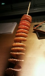 Hur det känns att gå längs Sveavägen och Odengatan med en halvmeterlång potatisspiralpinnne? Inte så illa som jag trodde! Så fort jag kom ut från den lilla ”Potato Twister”-kiosken på Sveavägen, alltså inom ett par, tre sekunder, var det en kvinna som vände sig om och frågade vad det var för något och jag fick förklara – friterad potatis. Femton meter senare samma sak. ”Vad är det där för något?” ”Friterad potatis från kiosken där borta!”