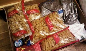 I morse kom Lettlandfararen Lotta och hämtade sakerna i sin lilla bil. Jag var på plats en stund innan och försökte bringa reda i blandningen – barnkläder och vuxenkläder och havregryn och konserver och tvål och dockor och filtar. Att det blev så mycket kläder gjorde att jag blev rädd att allt inte kunde tas med, så för säkerhets skull började jag dela upp det i sådant som var gångbart och mindre gångbart på Korskyrkans hemlösluncher. Dessutom tänkte jag mig att ju mer sorterat det är desto enklare blir det vid utdelningen, så jag hade fixat sex banankartonger som jag fyllde och skrev på, men sex kartonger var ju en droppe i havet. Men i slutänden blev allt bra. Fler kartonger hade inte gått in i bilen, det övriga, som låg i kassar, pressades bokstavligen in i bilens alla skrymslen och kvar blev en liten påse med vantar, halsdukar och mössor och två ytterplagg, sådant jag vet är hårdvaluta på hemlösluncherna.