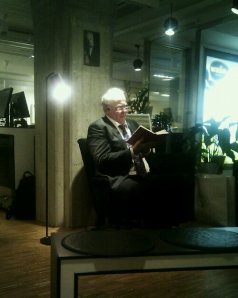 I dag var det stillsam postnobelstämning på Sture bibliotek. Vi bjöd på choklad som var över från gårdagens evenemang – Torsten Wahlund var återigen på plats och läste Tranströmer, den här gången en serie dikter, både äldre och nyare. Programmet blev totalt en timme långt med bensträckare i mitten, och under pausen var Torstens headset på, vilket innebar att hans: ”Hej hej! Tack för senast!” när han såg mig hördes i hela lokalen. Uppläsningen var riktigt, riktigt bra, och Torsten var fullständigt oberörd av skrikande barn utanför biblioteket, klamp i trappan, förbipasserande låntagare.