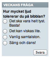 Veckans fråga på Vårt Kungsholmens webbplats (hittas en bit ner på till höger på min Kungsholmsbloggs sida). Rösta, vettja! Vi får många synpunkter kring detta på biblioteken. Alla tycker olika, men de som säger till tillhör oftast kategorin som drömmer sig tillbaka till hyssjande bibliotekarier (men som säkert inte gillade dem när de fanns).