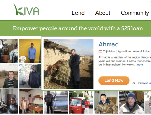 Klart man vill vara med och finansiera en skönhetssalong i Tanzania! Kivas idé är oemotståndlig – man avvarar 25 dollar, väljer en person bland många behövande som behöver ett lån på kanske 500 dollar till sin verksamhet, väntar in att tillräckligt många ska bidra, får tillbaka pengarna under en avbetalningsperiod på några månader, lånar ut dem igen till någon annan! Och jag har alltså just investerat mina 25 dollar i en tanzanisk skönhetssalong.