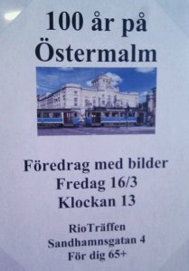 ”Är det föredragsflickan!” sa en glad medarbetare på servicehuset Rio på Gärdet när jag kom dit kvart i ett i dag med ett USB-minne och några papper med en förkortad version av Östermalmsföredraget jag höll på Östermalms bibliotek i tisdags. Den lilla lokalen fylldes snabbt av tanter och farbröder, jag öppnade bildspelet och försågs med mikrofon. Det är svårt att förbereda en presentation för en målgrupp man inte vet något om. Skulle de se ordentligt? Höra? Förstå? Vara intresserade av gatunamnsförändringar genom historien och bild efter bild på betydelsefull svartvit gubbe med mustasch?