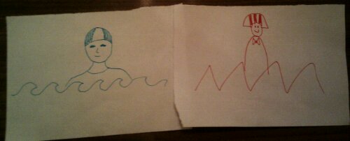 Ritleken var en nyhet för mig, en av få roliga lekar utan tävlingsmoment. Konceptet är detsamma som i viskleken, men här ritar alla varsin bild och visar upp den för grannen, som sedan ritar av den ur minnet och visar för nästa. Eftersom vi var sju personer blev resultatet sju bilder som förvrängts i sju steg. Min personliga favorit var min egen bild, som föreställde Lisette i badmössa, och som i sjunde steget hade uppfattats och ritats av Veronica som ”en gubbe i egyptisk hatt”. Hur flugan kommit till på vägen är okänt.
