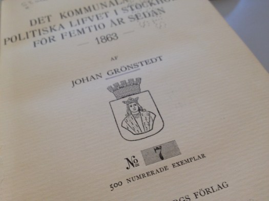 Tack vare siffran känns det så exklusivt att vi har den här boken på Gamla stans bibliotek, trots att den i övrigt inte gör något särskilt märkvärdigt intryck, en 99 år gammal bok (1913) om det kommunala och politiska lifvet i Stockholm, som det tedde sig för 149 år sedan (1863).