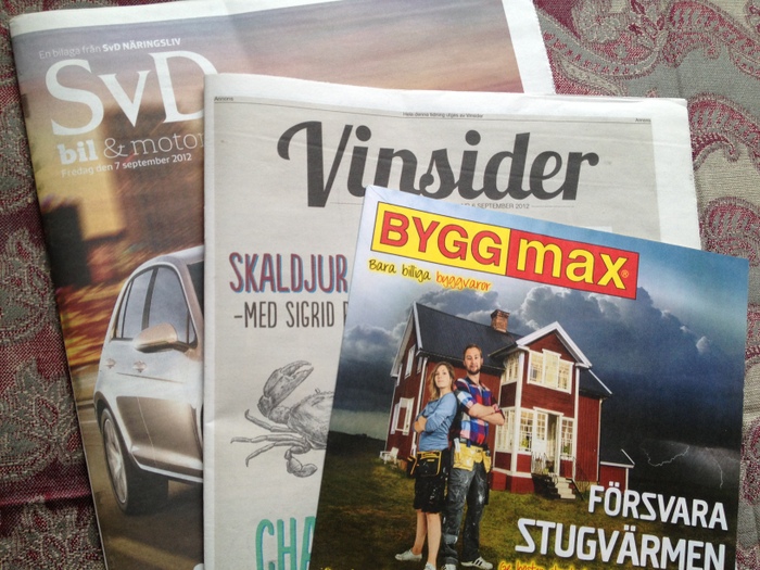 Testar Svenskan ett tag. Första tidningen kom i dag. Några saker kunde plockas ut med en gång – Byggmax-bilagan (”Bara billiga byggvaror”), Vinsider-bilagan (”Din insider i vinvärlden”) och SvD Bil & Motor (”SvD Bil & Motor har fått en unik förhandstitt på den sjunde generationen Golf”). Näringslivsdelen fick en snabb blick. Går igenom nyhetsdelen nu och sparar det bästa – kulturdelen – till sist.