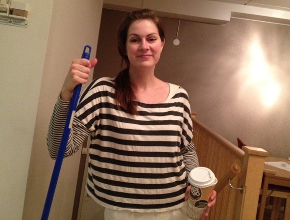Haha, klockren bild på min syster! Mopp i ena handen, kaffe i andra och en nöjd min. Sån är hon!