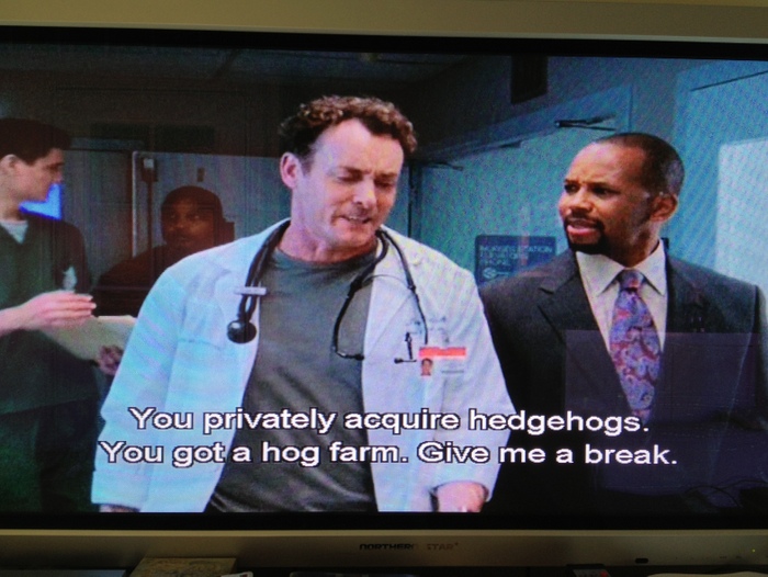Johan i hemgruppen är min Scrubs-dealer. Så fort jag blir klar med en säsong får jag en ny. Just nu är jag i slutet av fjärde säsongen och har precis fått en ny Dr. Cox-favorit, där han försöker återge vad hans ungdomsvän förklarar att han arbetar med.