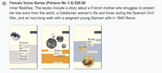 I somras råkade jag läsa ett blogginlägg i en främmande bokblogg om det lilla engelska förlaget Peirene Press, som ger ut kortare skönlitterära texter – de ska ta upp till två timmar att läsa – som tidigare inte funnits översatta till engelska. Det var något för Sture bibliotek att ta in, tänkte jag. Idén, formatet och omslagen trodde jag också skulle falla kollegan AnnCharlotte i smaken, och jag sparade idén som en möjlig present från oss på Sturebibblan när AnnCharlotte nu i höst skulle få barn. Så blev det också, jag beställde nyligen ett paket på tre små böcker i en serie kallad ”Female Voice Series”, och när jag gjort beställningen fick jag ett mail från förlaget där man undrade hur jag fått reda på att de fanns. Jag mailade tillbaka och beskrev hur det låg till, och i dag hittade jag mitt mail citerat på Peirene Press Facebook-sida. Så kan det gå.