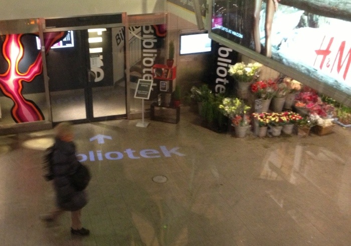 Hur som helst – påminnelsen om vårt dolda läge på tunnelbanestationen ledde till en mycket konkret åtgärd. Det främsta och mest svårlösta problemet är att biblioteket ligger en trappa upp i förhållande till frisersalongen, blomsteraffären, bokhandeln, lunchstället och alla andra butiker på båda sidor om gången mellan spärrar och uppgångar till gatan. Medan man vid de övrigas inbjudande entréer ser utställda blombuketter och pockettravar ser man vid bibliotekets mörka lilla ingång en trappa bakom glasdörrar. Om man tittar ordentligt. Därför riggade vi i dag upp en hylla med utrangerade böcker utanför dörrarna, med uppmaningen att komma upp till biblioteket och betala. Det kändes riktigt lyckat. Några böcker såldes och ganska många förbipasserande stannade till och tittade och bläddrade, vilket man kunde se om man spejade ut genom bibliotekets fönster ner mot tunnelbanegången.