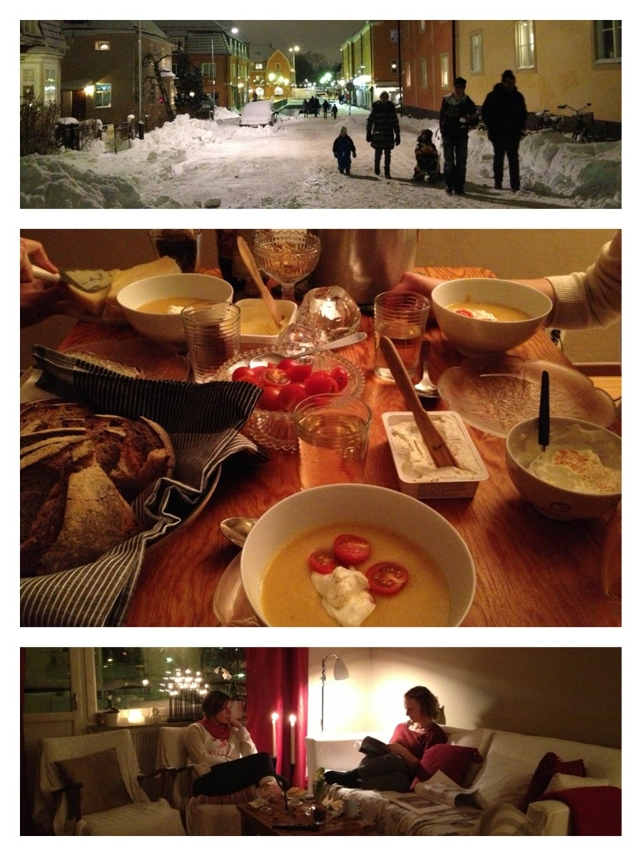 För ett och ett halvt år sedan flyttade Charlotta och Henrik från Stockholm till Skövde och i helgen är Charlotta på besök här i stan. I går mötte jag upp henne och Sofia på bageriet i Gamla Enskede (idylliskt till tusen i vinterskrud) och sedan åt vi hos Sofia och pratade och pratade.