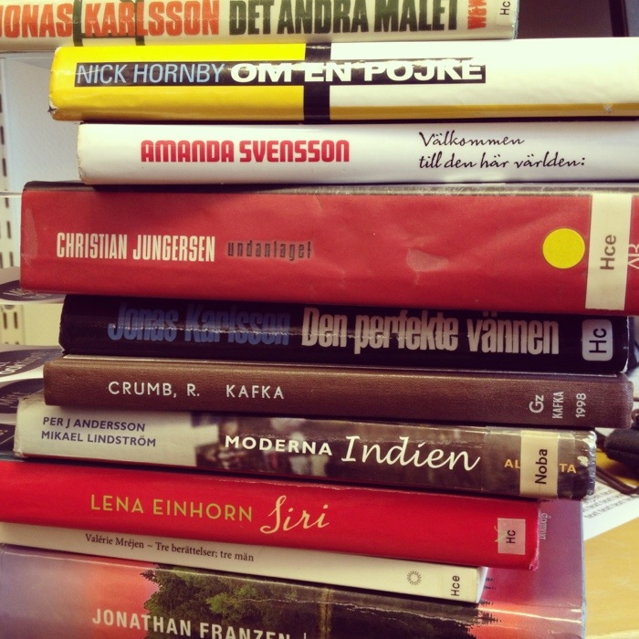 23 april 2012 – världsbokdagen – befann jag mig på dess ursprungsplats Katalonien. I morgon finns jag på hemmaplan. På Gamla stans bibliotek, där jag kommer att vara, har vi lika mycket bokdag som alla andra dagar, men på några bibliotek i stan uppmärksammas dagen lite mer. Östermalms bibliotek har inget särskilt evenemang, men väl en utställning med personalens boktips. Jag jobbade med det förra veckan, plockade bok efter bok ur hyllorna och skrev korta boktipstexter. Det var beroendeframkallande. Några av mina tips syns ovan. Kom och låna i morgon!