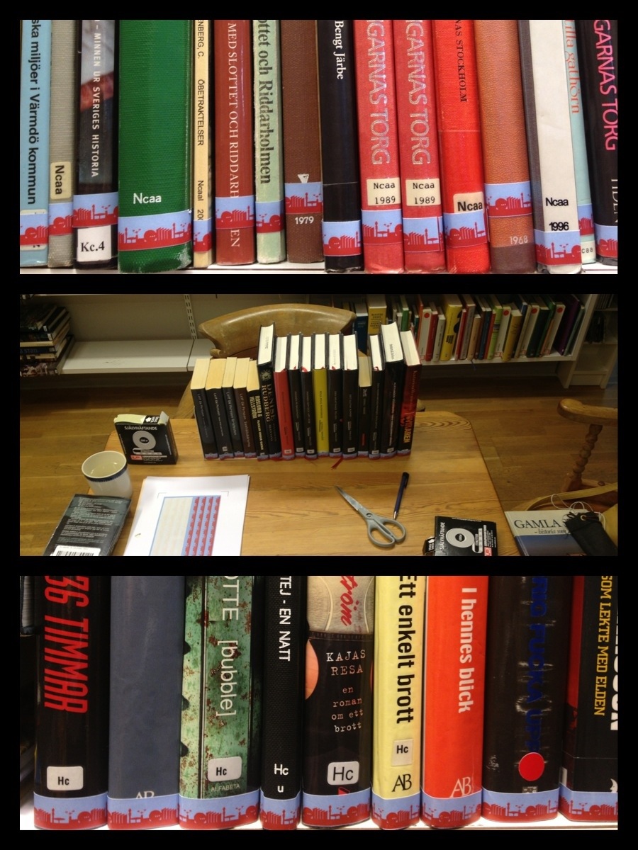 När jag kom in på igenbommade Gamla stans bibliotek i eftermiddag och gick längst in till Stockholmshyllan höll jag på att bli gråtfärdig. Våra två tonåriga sommarjobbare hade arbetat flitigt med bokmärkning under tiden jag var borta på semester, men mina instruktioner hade missuppfattats. Ryggmärkningen med skylinemotiv såg inte ut som en skyline, det såg ut som hyllmeter efter hyllmeter av galen bergochdalbana. Alla klisterremsor satt på olika höjd. Insidesmärkningen verkar de ha fått till rätt bra, men summan av kardemumman är nog dessvärre att de stjälpt snarare än hjälpt. (På grund av missuppfattningen och inget annat, de var jätteduktiga och trevliga och har nu jobbat klart hos oss.)
