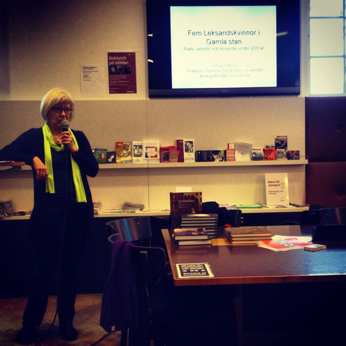 Men för att vara främling kände jag mig väldigt bekant med det mesta. Böckerna som presenterades var utgivna på Stockholmia förlag, vars representant berättade att de har lokaler i Stadsmuseet – det vet jag mycket väl, passerar deras rum flera gånger i veckan. Den första bokpresentationen hölls av Anna Götlind som skrivit Förbindelser, med den underrubrik som syns på skärmen ovan, och den av de fem kvinnorna hon valde att prata om under presentationen var ”vackra dalkullan”, Carin Ersdotter, som jag bekantade mig med ganska grundligt under arbetet med Stockholmskällan.