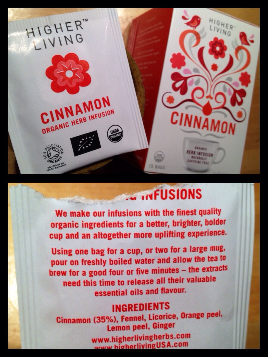 Har testat örtteet med kanel från Higher Living. Snyggt paket (liksom alla andra av samma märke), fin doft, svag smak. Lite som låtsaste för den som vill undvika koffein, eller varför man nu inte vill dricka vanligt te. En kvällsdryck, men ingen märkvärdig sådan.