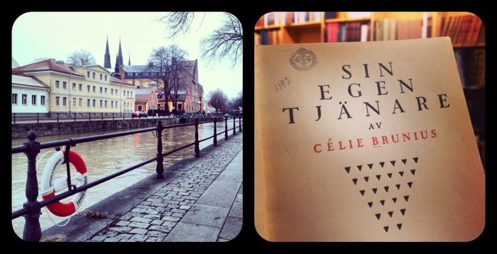 Den blev hur som helst lånad i dag från det enda bibliotek i landet som har ett utlåningsbart exemplar, nämligen Carolina, som det säkert fortfarande kallas. På min tid hette Uppsala universitetsbibliotek Carolina Redivia, men nu tycks det officiellt heta Carolinabiblioteket. I dag har jag haft min var-sjätte-vecka-lediga-fredag, vilket är den absolut lyxigaste dagen i schemat och den vill man göra något bra av. Den här gången blev det alltså en tur till Uppsala med besök på Carolina och Stadsbiblioteket, fika med Uppsala-Erica på Café Linné Konstantina, besök på en amerikansk butik där vi båda köpte sötsaker, vidare till The English Bookshop där jag köpte en bok om Jane Austen och slutligen till en engelsk butik ungefär motsvarande den amerikanska, där vi köpte mer sötsaker. Utanför den butiken skildes vi åt och jag tog den korta promenaden till stationen, där jag såg att ett tåg skulle gå till Stockholm om bara några minuter. Jag borde hinna köpa biljett i automat, tyckte jag, men det var en typ av automat jag inte var van vid och jag lyckades göra fel och fick göra om och sedan springa som en dåre till spåret. Jag såg att ett par ur tågpersonalen tycktes vinka till varandra längs perrongen att det var fritt fram att köra, men en dörr var fortfarande öppen. ”Hinner jag!?” flåsade jag till tågvärden. ”Ja, men skynda dig, nu rullar vi!” sa hon, och menade det bokstavligen. Jag hoppade med andra ord på i farten! Och tågvärden måste ha hoppat på direkt efter mig, för hon kom strax och kollade biljetter.