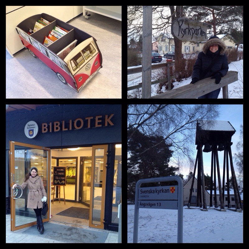 Bokbuss. / Ett två dagar gammalt bibliotek. / Letar efter kyrkan, hittar Kyrkparken. / Märsta kyrka.