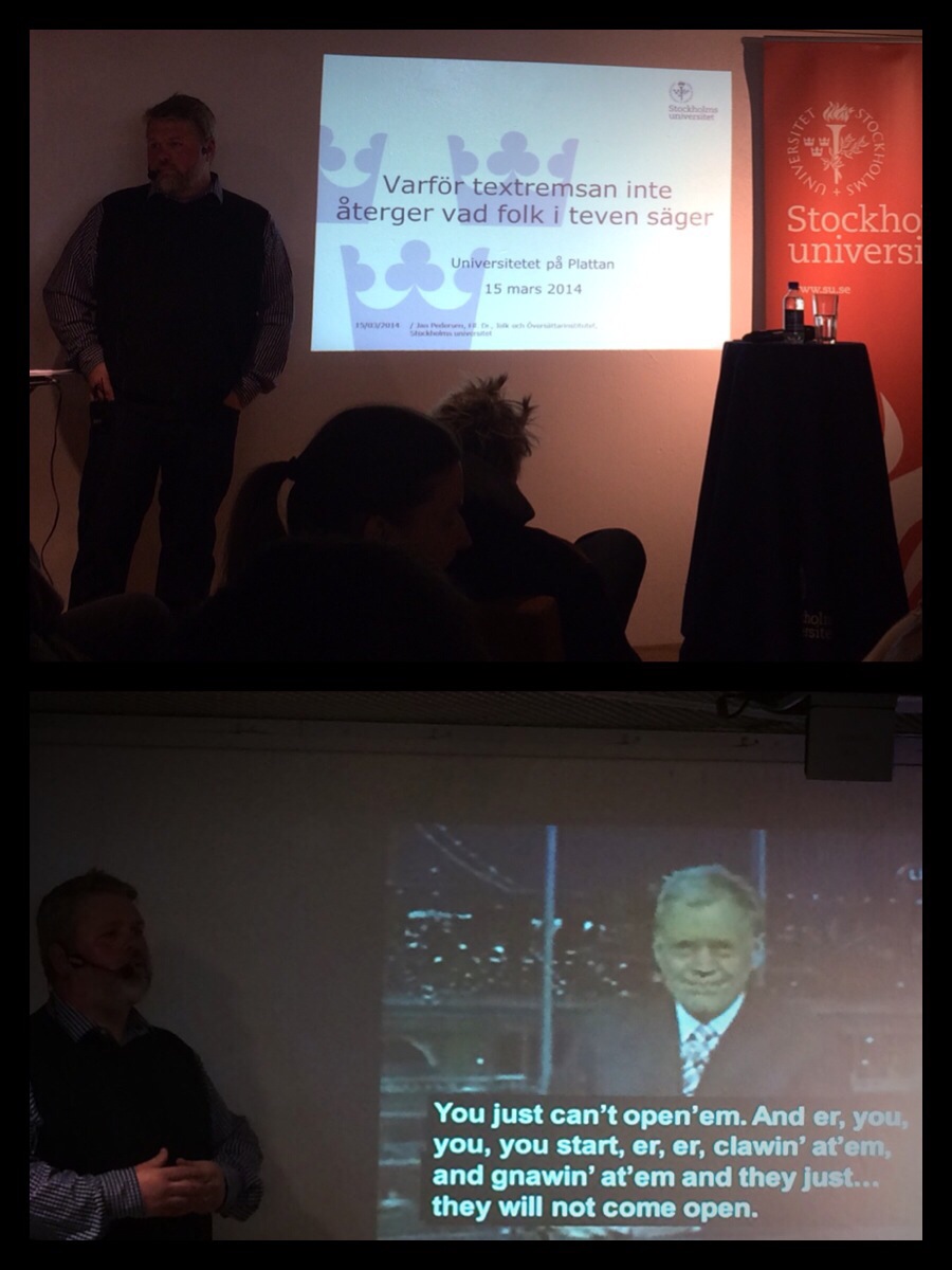I lördags var jag på en liten föreläsning i serien ”Universitetet på Plattan”, den här gången om undertextning, närmare bestämt svensk textning av TV-program på engelska. Föreläsaren berättade att han jobbade med det ett antal år, innan han började forska, och att han fick två reaktioner när han talade om det för personer han inte kände. Först kom ett positivt: ”Jaha, du jobbar med media …” Därefter ett missnöjt: ”Men varför står det hela tiden fel i texten?”