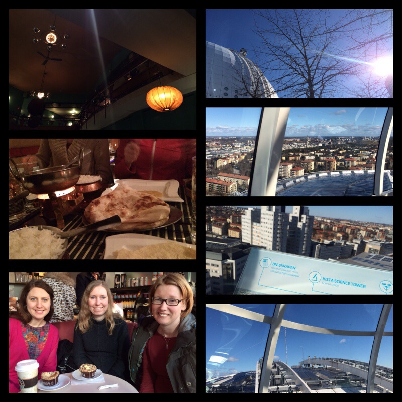 Som så många gånger förut hade Annika varit med i en tävling och vunnit ett extravagant pris, den här gången en hotellvistelse på Clarion Sign här i Stockholm, men mellan fredag och lördag bodde hon över hemma hos mig. Vi pratade till tre på natten och började igen halv åtta på morgonen. Under lördagen kom så de tre vänner, från olika håll i landet, som hon skulle dela vinsten med och de tillbringade dagen tillsammans, bland annat med en eftermiddagsmusikal på China Teatern. Jag mötte upp i foajén efter föreställningens slut och tog med dem till favoritindiern Mandira, där vi åt tills det bara inte gick längre och Annika valde en stark rätt som gjorde henne alldeles röd. Dagen därpå var det jag som blev bjuden på vinst, nämligen en SkyView-tur på Globen. Kalasväder och fin utsikt.