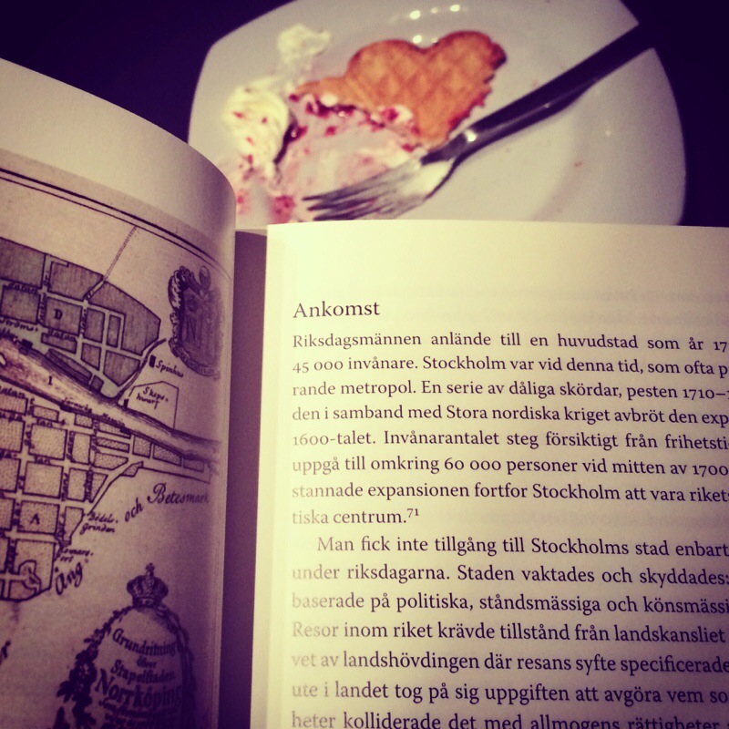 Håller mig vaken med våfflor – det är ju trots allt våffeldag – och försöker hålla Stadsmuseets biblioteksbok fri från hallonsylt och grädde. Klockan är massor. Vinden viner dramatiskt och fönsterrutorna är regnspräckliga. Gör mitt bästa för att intressera mig för hattar och mössor och övriga politiska inriktningar efter Karl XII:s död.