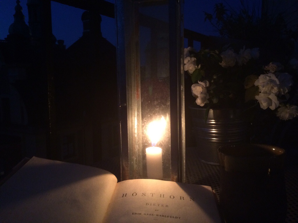 Men i kväll stängde jag av nyhetsbruset för ett tag, satte mig på balkongen och tog del av några av de många, många förmåner som finns inom mitt räckhåll. Te. Frisk luft. Ett nästan folkfritt kvällslugn. 150-årsjubilaren Karlfeldts dikter. Bara för att jag hade lust. Jag skäms inte för det, men önskar att vi alla kunde få sitta på balkongen och läsa när vi har lust.