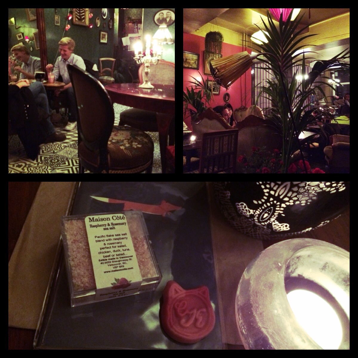 Och så utbytte vi presenter. Jag hade med mig en påse Candy Kittens från Wells, Jenny Vancouver-producerat hallon- och rosmarinsalt och ett skrivhäfte från Vancouvers biblioteksbutik Bookmark (eller book’märk, som det skrivs), med en korsning mellan en räv och en tax på framsidan, iklädd basker och halsduk.