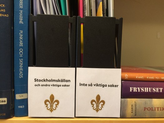 Ofta har man för mycket tid ute i biblioteket och för lite inne vid skrivbordet. Nu har jag haft mycket skrivbordstid, och jag klagar inte det minsta, det finns alltid massor att göra, men om man stirrar på databasposter i lite för många timmar i sträck kan man bli rastlös och börja ge sig själv helt nya uppgifter. På eftermiddagskröken i dag bestämde jag mig till exempel för att sortera in min pappershög i två tidskriftssamlare och märka upp dem med lämpliga etiketter. Jag tror det blev lite snett, men det gör inte så mycket.