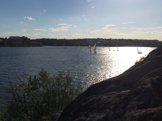 Jenny H och jag hade den här veckan hemgruppsträff i det fria. Den började med en promenad med bryggorna vid Norr Mälarstrand som utgångspunkt och när vi hade nått Fredhällsklipporna tog vi fram matsäcken. Därmed hade vi rört oss från min bakgård till Jennys, som vi valde att se det. Att ha tillgång till vatten i stan är ju en makalös resurs, och lyxigast av allt var storleken på de revir som gick att muta in. Vi lämnade stigen, gick ut på klipporna, såg ingen alls, ingen alls, ingen alls, två grabbar (de hälsade belevat när vi passerade deras klippa), ingen alls, ingen alls, och så satte vi oss på en bänkliknande plan klipphäll. De enda som passerade i vårt synfält var förare och passagerare i de många båtarna ute på Mälaren.