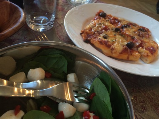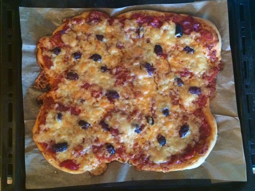 Det var den pizzan. Bakades i går (med citronolja i tomatsåsen, en hit om man frågar mig), bitarna som hamnade i kylen tog slut i dag. Den gjordes till gårdagens filmkväll.
