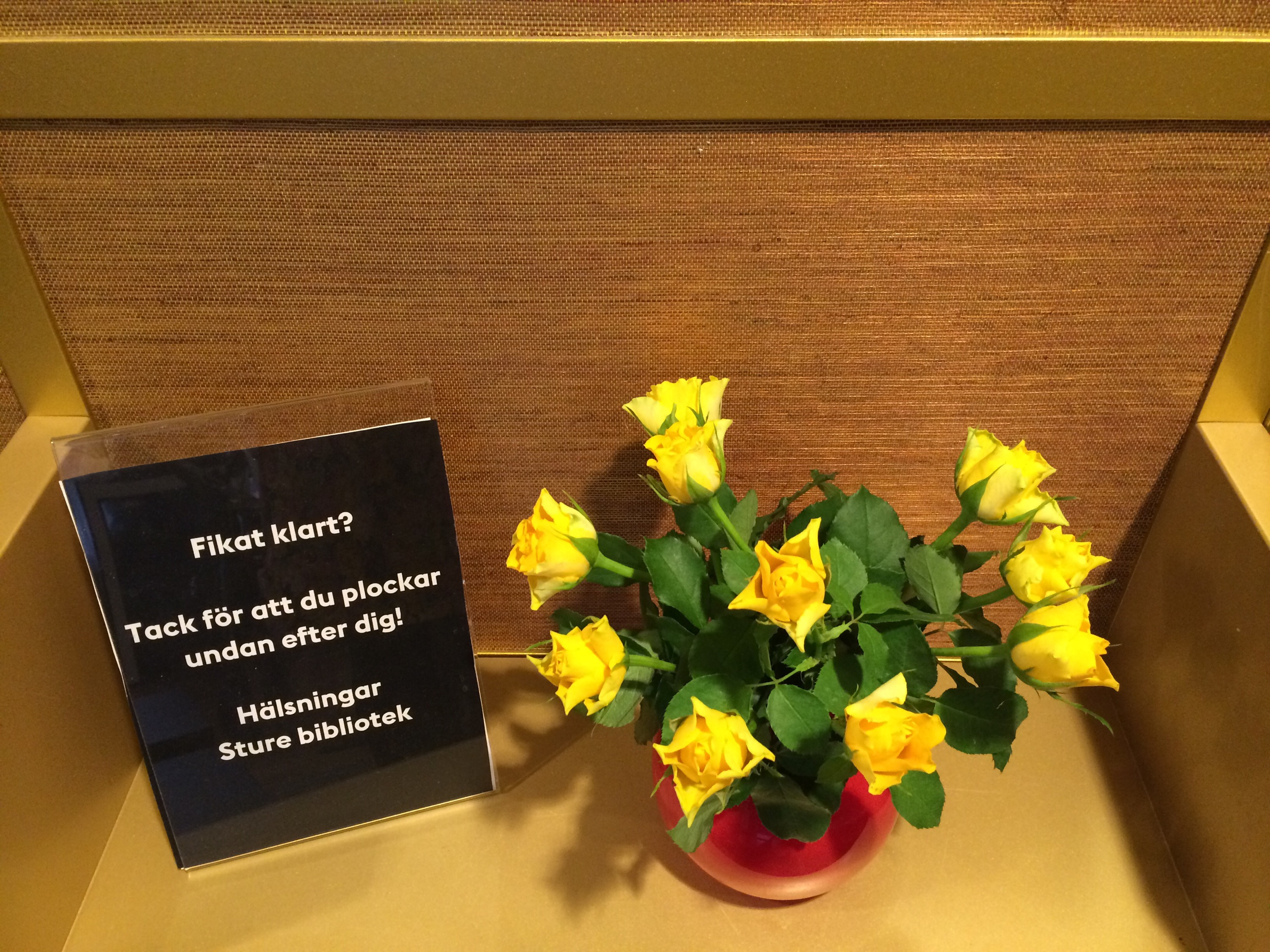 En stund senare gick jag ner till Wiggo och köpte lunch av en yngre och en äldre medarbetare på wrap- och salladsstället, som har koll på var jag jobbar och vad jag brukar vilja ha och gärna småpratar. Under tiden jag väntade på min sallad gick jag och köpte rearosor på T-Jarlen, som sedan fick stå i bibliotekets soffhörna och blidka besökarna.