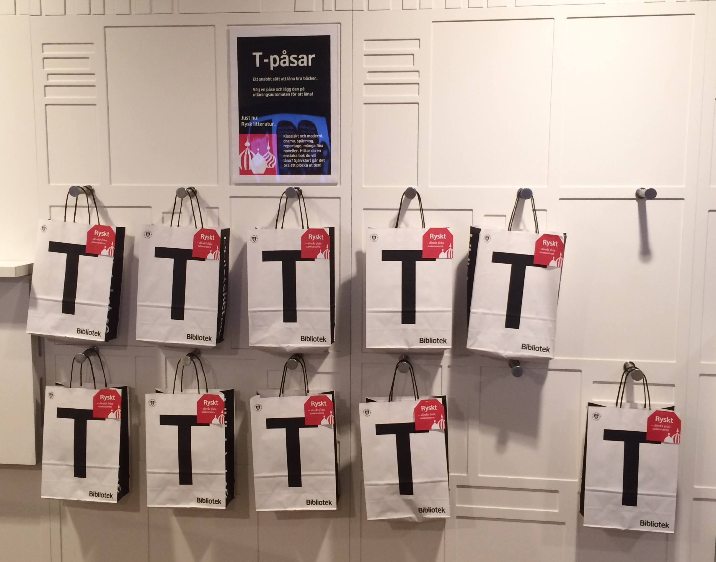 Hurra, de ryska påsarna lånas! Nu när vi erbjuder läsecirklar om rysk litteratur på Sture bibliotek följer ”T-påsarna” samma tema. Med det begränsade utbudet på vårt lilla bibliotek fick jag lov att beställa in rysk litteratur – i svensk översättning, alltså – från andra bibliotek och det var en riktigt lärorik övning bara att gå igenom den gamla och nya ryska litteraturen i bibliotekskatalogen. Eftersom syftet med påsarna är att locka till spontanläsning av sådant som man inte aktivt letar efter valde jag bort de tjockare böckerna och äldre böcker med intetsägande, slitna omslag, och även om det nog blev en hel del litteratur med samhällskritiskt innehåll ville jag i sammanhanget undvika alltför svartmålande historier. Mer berättarkonst än politik i påsarna den här gången. Därmed passade alla äldre men ofta nyutgivna noveller jag hittade perfekt, av klassiska författare – Dostojevskij är mest välrepresenterad – och några för oss mindre kända, i samlingar eller utgivna styckvis. Novellen är en utmärkt form om man vill provsmaka litteratur. Men där finns också romaner av olika slag, deckare, reportageböcker. Själv skulle jag kunna välja vilken av påsarna som helst.