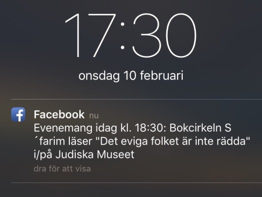 I ett närmare förflutet, i november i fjol, startades bokcirkeln S’farim (det hebreiska ordet för böcker), ett samarbete mellan Judisk Krönika och Judiska Museet, med min kollega Annika som anlitad cirkelledare. Jag hade väldigt gärna velat vara med på den där första träffen – för att det är kul att se hur cirklar går till hos andra arrangörer än bibliotek, för att jag bara hade varit på Judiska Museet en enda gång, för att boken de skulle prata om var Arons bok av Jim Shepard, som jag då precis hade börjat läsa, och för att jag vet att Annika är en bra cirkelledare – men den kvällen skulle jag själv leda en cirkel på Sture bibliotek. Jag hoppades att det skulle funka med mitt schema vid nästa tillfälle, och det gjorde det – det inföll i går och den aktuella boken var Det eviga folket är inte rädda.