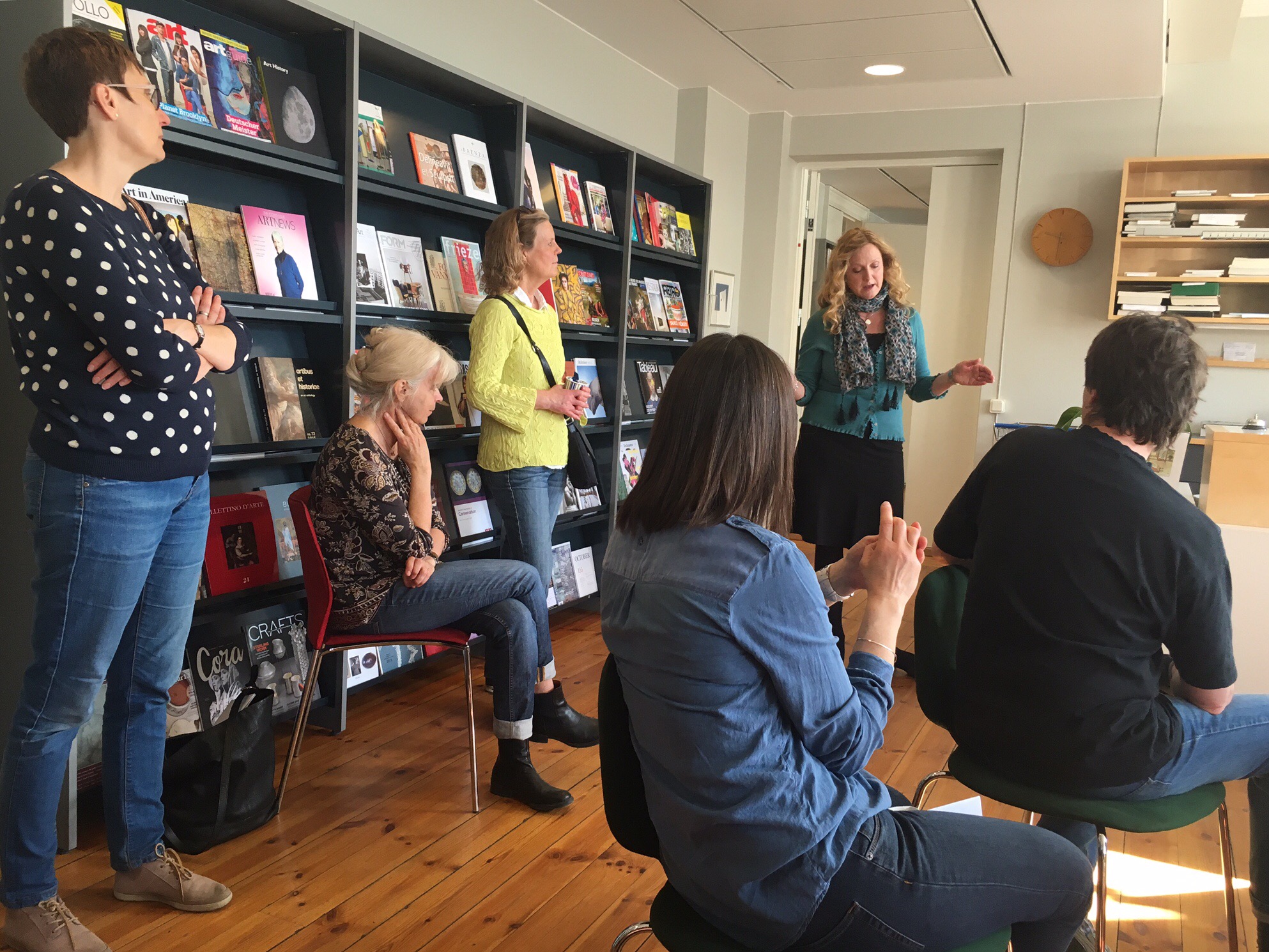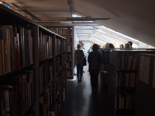 Vi får en genomgång av verksamheten, hur personalen jobbar och vilket slags service som erbjuds för allmänheten, som vi emellanåt har anledning att hänvisa vidare till det här biblioteket när de kommer till oss med konstfrågor.