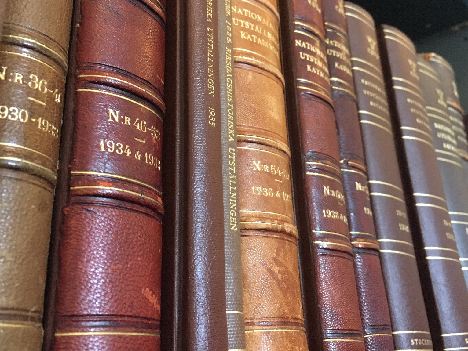 I samlingarna finns bland annat Nationalmuseums utställningskataloger i inbunden form.