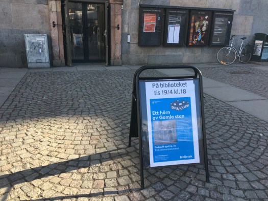 Vi kan väl säga så här – jag gjorde mitt bästa. Föredraget genomfördes. Det var kul att vara på Tranströmerbiblioteket, jag har bara några enstaka gånger haft ärenden dit i tjänsten, annars har jag tittat in då och då som besökare i samband med träningen i samma hus och gått på en del program. Nu höll jag alltså ett själv, mitt föredrag om Gamla stans historia, för lite drygt tio personer, varav en blev ordentligt upprörd för att en annan satte sig framför henne och en annan – onykter – flikade in underliga kommentarer under föredragets gång, trots tillsägelser. Men vi gamla bibliotekarierävar är luttrade, det var ingen större fara.