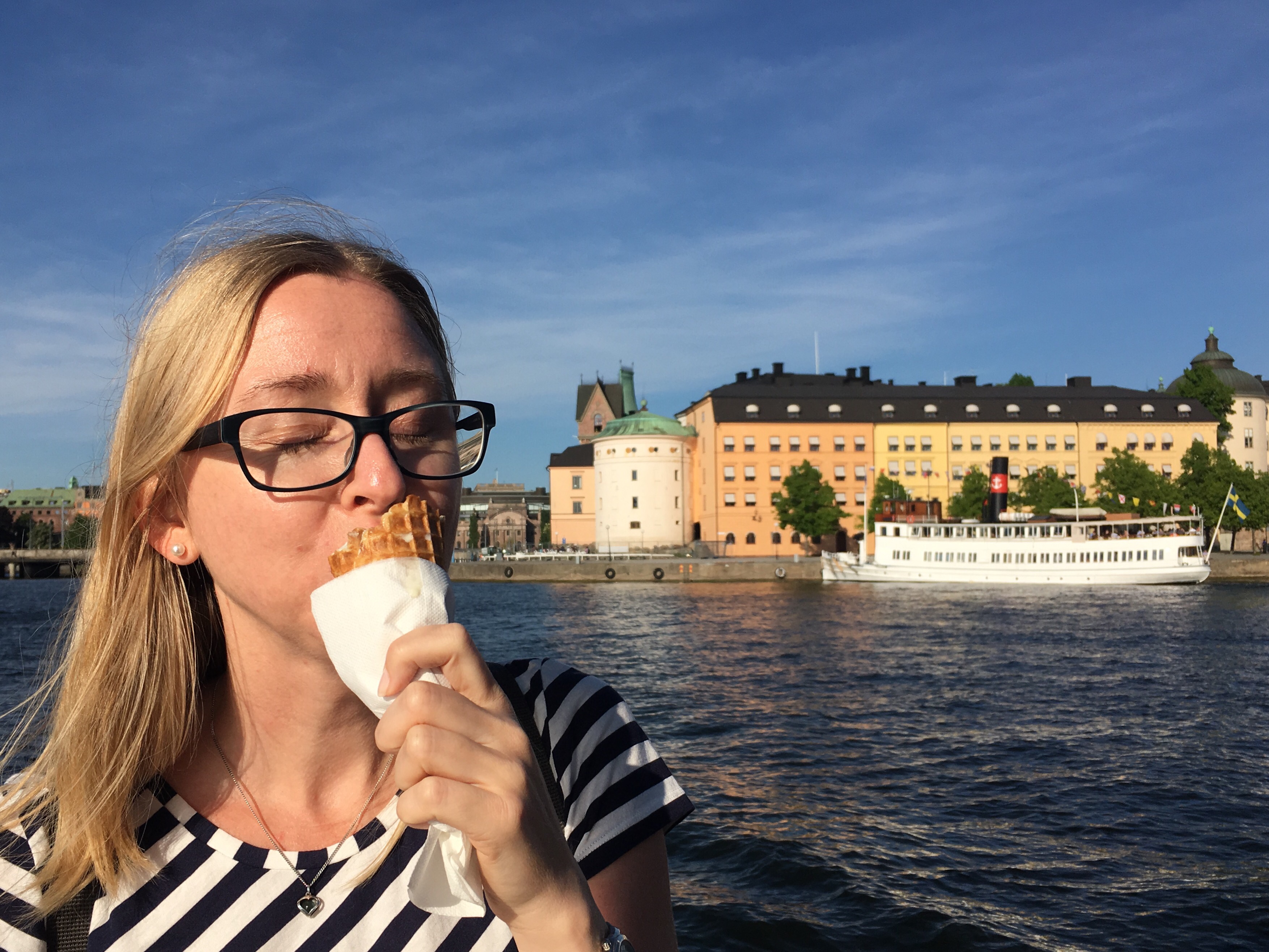 Här gick jag omkring med det felaktiga intrycket att tornet i Kungsan, som man kunde åka upp i och som byggdes upp i samband med Eurovision-hysterin, skulle stå kvar några dagar till. Jag föreslog för Jenny F att vi skulle åka upp, men när vi väl kom dit – inget torn. Så vi åt glass och åkte lite pendelbåt istället. Sedan satte vi oss på en bänk vid Norr Mälarstrand och pratade om apotekskedjor, löneutveckling och de bästa deckare vi läst.