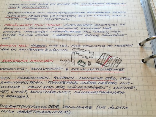 Milda Merkurius! För 21 år sedan, när jag var nybliven student, måste något slags grundskoleränder fortfarande ha suttit i. Jag känner igen de illustrerade anteckningarna när jag ser dem – och nu råkade jag se dem på grund av skåpsrensning – men oj vad detta känns avlägset. Hoppas jag lärde mig något om Sveriges befolkning under 1800-talet. Mer än eventuella historiekunskaper saknar jag min förlorade handstil.