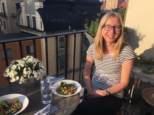 Men nu hamnade några blad i pastasalladen. Delade den med Jenny F., som tycker att mangold smakar riktigt gott, ”jordigt, som en gammal källare”. Själv tycker jag att min favoritört koriander smakar metall. Finns också på balkongen.