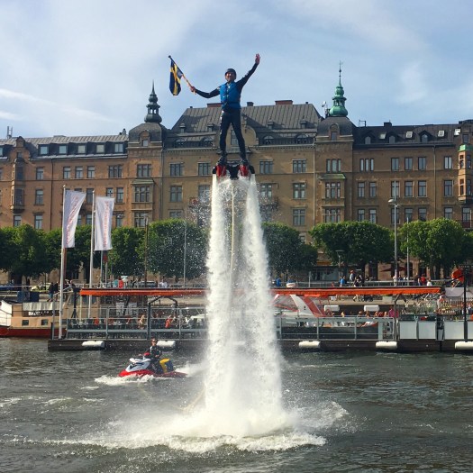 Dagen avrundades på Sjöcaféet vid Djurgårdsbron med några vänner. I väntan på att den kungliga kortegen skulle åka förbi blev vi underhållna av den här vattenburna mannen. Han flög runt kors och tvärs på vattenstrålarna och viftade med flaggan dagen till ära. Vi hade ingen fantastisk uppsikt över kortegevägen där vi satt, men tillräckligt bra för att sitta kvar medan hästarna och vagnarna passerade, och som tur var var den sida av Djurgårdsbron som vetter mot caféet avspärrad och folkfri, så när de vinkande kungligheterna for förbi skymtade vi dem, i alla fall. Jonas höll telefonkontakt med sin flickvän – relativt nyhitflyttad, tror jag, från Finland – som inte kom förbi avspärrningarna. Hon fick stå i kortegepubliken tills vidare och när äntligen kunde komma ner till caféet visade hon bilder hon tagit på kungens vagn och ursäktade sina exalterade utrop med att det var första gången hon upplevde något sådant här. Och tja, jämför man med norrmännen har vi väl lite mesiga nationaldagstraditioner, men den som vill fira, i alla fall här i Stockholm, kan inte klaga på festlighetsutbudet.
