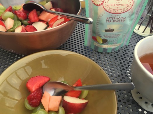 Vid kvällens kompisfika tog jag till mitt vanliga fruktsalladknep. Som svar på frågan ”ska jag ta med mig något?” säger jag ”två sorters frukt eller bär”, vilket jag också köper själv. Den här gången blev det en fruktsallad på gröna druvor, nätmelon, jordgubbar och platta persikor.