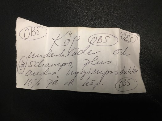 Efter att jag stått i Sturebibblans arbetsrum och beklagat mig en lång stund över mitt förfärliga öde – att jag efter stängning måste gå till Åhléns och köpa underkläder och andra praktiska saker innan en rabattkupong går ut – skrev Helena den här lappen.