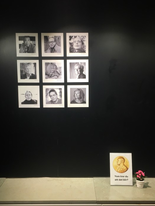 Nä, jag tror mig inte kunna gissa årets Nobelprisvinnare, men har nu tagit del av oddslistan och gjort ett litet urval för den som passerar Sturebibblans just nu utställningslösa utställningsvägg och vill spekulera själv. Hur urvalet är gjort? Namn jag kände igen eller tyckte lät kul samt en överrepresentation av kvinnor i förhållande till vad oddssättarna tror.