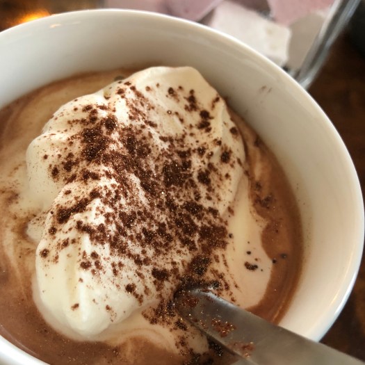 I dag erbjöds några timmars sol. Varken L eller jag är särskilt ljusberoende, men jag lyckades övertala henne att komma igång hyfsat tidigt en ledig lördag och mötas upp vid Hornstull och Västerbrons södra fäste för promenad. Utlovade varm choklad på Kungsholmssidan. Jag har ett stort chokladpulverutbud just nu, mint, salt karamell, kanel och så vidare, det mesta från Whittard, men L valde Ho-Ho Hot Cocoa från australiensiska Koko Black. Enligt paketet ska det smaka ”cinnamon, orange, nutmeg, cloves, ginger, cardamom and white pepper”, men mest framträdande är apelsin. Det blev extra piffigt med glitterkakaon jag fick i julklapp.