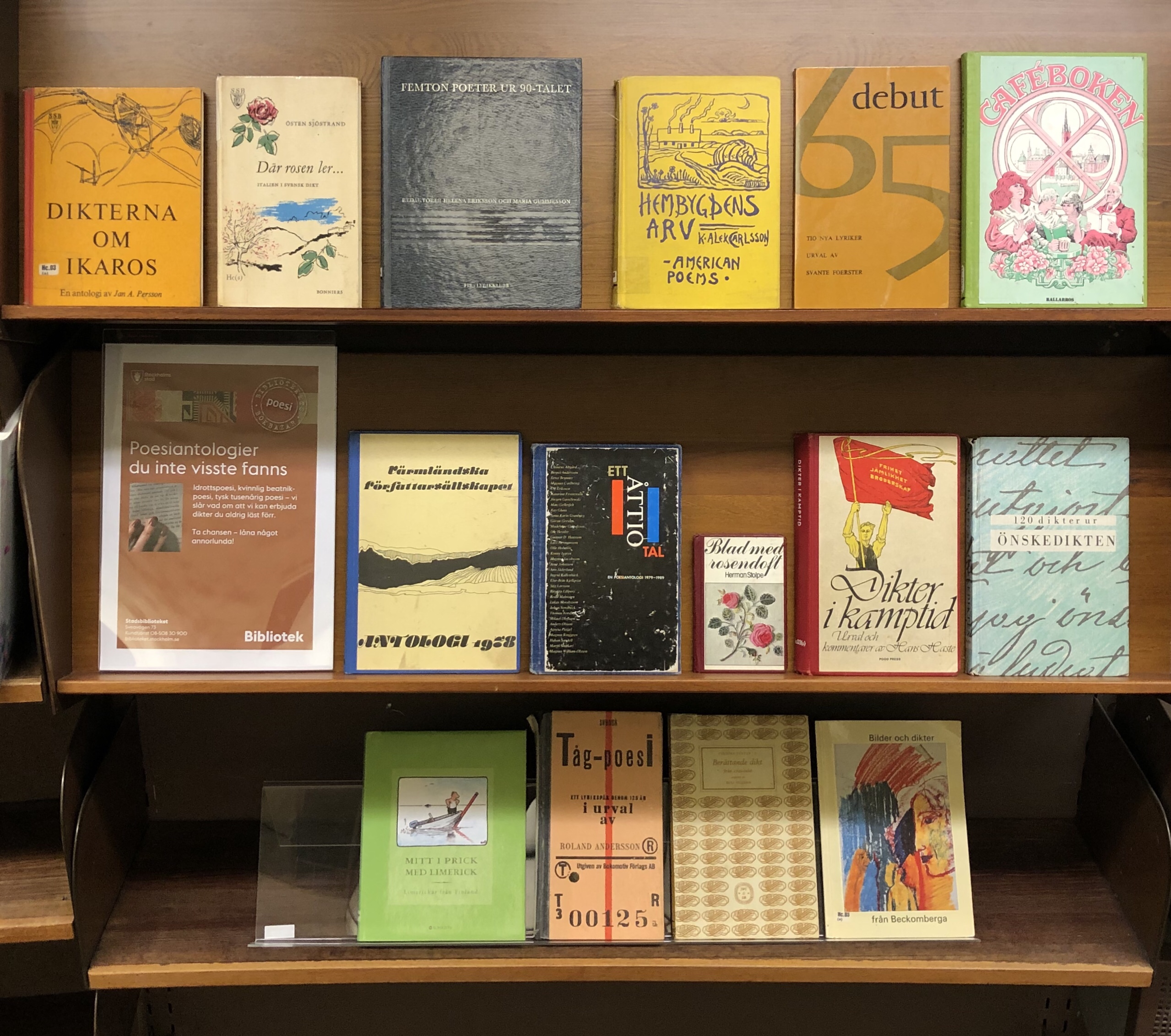 Det som gläder mig mest är att programmet ”Månadens diksamling” fortsätter – första tillfället för året är 26 februari – och vad gäller skyltningen är jag själv numera indragen. M och jag har gjort upp en temaplan för de kommande månaderna och jag började enkelt med ”poesiantologier du inte visste fanns”. Det rör sig visserligen mer än man kanske tror på poesiavdelningen, men just den här temaskyltningen är kanske mer rolig än lockande för hemlån. Just nu står där bland annat dikter från Beckomberga, tågpoesi, en limericksamling, svensk poesi rörande Italien och ett antal antologier som blir intressanta bara för att de representerar en annan tid. Att hitta temaenliga böcker att skylta med är lätt som en plätt, antologier står för sig både i hyllan i rotundan och nere i magasinet och det är bara att plocka de som ser roliga ut, och det skulle förvåna mig om det blir luckor på skylthyllan i alltför snabb takt. Men blir det huggsexa om tågpoesi och åttiotiotalsdikter är ingen gladare än jag.
