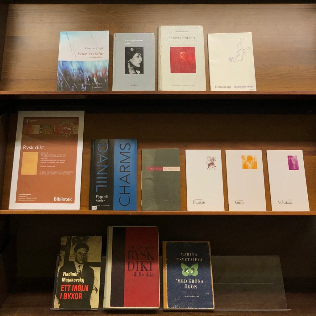 Att jobba till 21.30 en kväll i veckan är inget jag gör frivilligt, men det har sina fördelar. Mot slutet av kvällspasset brukar det vara lugnt i rotundan och jag kan ägna mig ostört ganska långa stunder åt en av mina stora passioner – bokskyltning. Här ses de ryska diktsamlingarna som stått framme under februari månad och snart ska bytas ut mot ett nytt tema. De kanske inte har försvunnit från poesiskylthyllan i en alltför rasande takt, men jag har definitivt behövt fylla luckor efter lånade böcker oftare än jag vågade hoppas. Som vanligt får jag en glädjekick varje gång en ålderstigen diktsamling av Pusjkin eller Brodsky, med skavt och omodernt omslag, får komma upp ur magasinet för första gången på länge och mot alla odds lockar en besökare till lån. Eller ännu hellre – en obskyr rysk poet jag aldrig hört talas om, men vars verk finns i våra gömmor, orörda sedan femton, tjugo år.