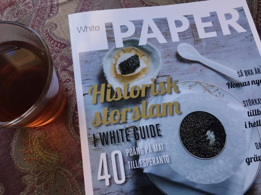 I förrgår, världspressfrihetsdagen, var det återigen halva priset på Pressbyråns alla tidskrifter. Bland annat köpte jag restaurangguiden White Guides tidskrift White Paper, som jag först bläddrade lite i – artikeln om restaurangers alkoholfria alternativ lockade mest – och nu i kväll började läsa på allvar. Numrets första artikel, med rubriken ”Samma klass, olika skolor”, är en genomgång av Sveriges topprestauranger just nu, som Fäviken Magasinet och Esperanto, med kommentarer om rätter som utmärker sig och övriga faktorer som avgör White Guides poängsättning.