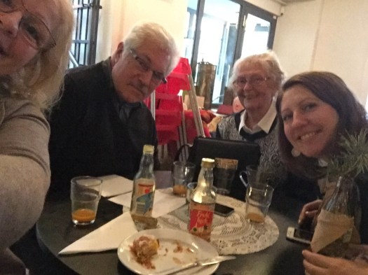 Det mesta av maten serverades vid bordet. De små portionerna dukades fram för grupper om sex personer, så vi två och fyra till skickade runt sillburkar, senapsburkar, grisfötter (premiär för mig), en potatiskarott som jag brände mig något vansinnigt på och en massa annat, medan andra delikatesser som ost och små köttbitar togs från en gemensam bräda lagd över två små trädstubbar på bordet. Det var trevliga och ytterst sociala människor vi hamnat vid, så det var enkelt att utgöra ett portionssällskap. Den varma maten serverades som buffé, men till skillnad från den bordsserverade var den dåligt beräknad, mycket var slut när Jenny och jag kom fram i kön, så när det var dags för den andra buffén, desserterna, störtade vi fram och kunde ta för oss så mycket vi ville av saffranspannkaka, äppelkaka, mjuk pepparkaka, klenäter och det mesta man kunde önska sig i dessertväg, medan konfekten kom till bordet på ett litet våningsfat. Maten skulle motsvara ett julbord 1907, men jag tror att de tänjt lite på gränserna när de serverade flortunna små flak av mörk choklad med ett rött pulver på, sannolikt frystorkade hallon eller jordgubbar, och små kuber av ljus fudge. Sammantaget var det ett riktigt bra julbord med vällagad mat, bara bestående av klassiska rätter men ändå väldigt omfattande. De många men små matbitarna visade tydligt att poängen var att uppleva smaker, inte att glufsa i sig av det man gillar mest.