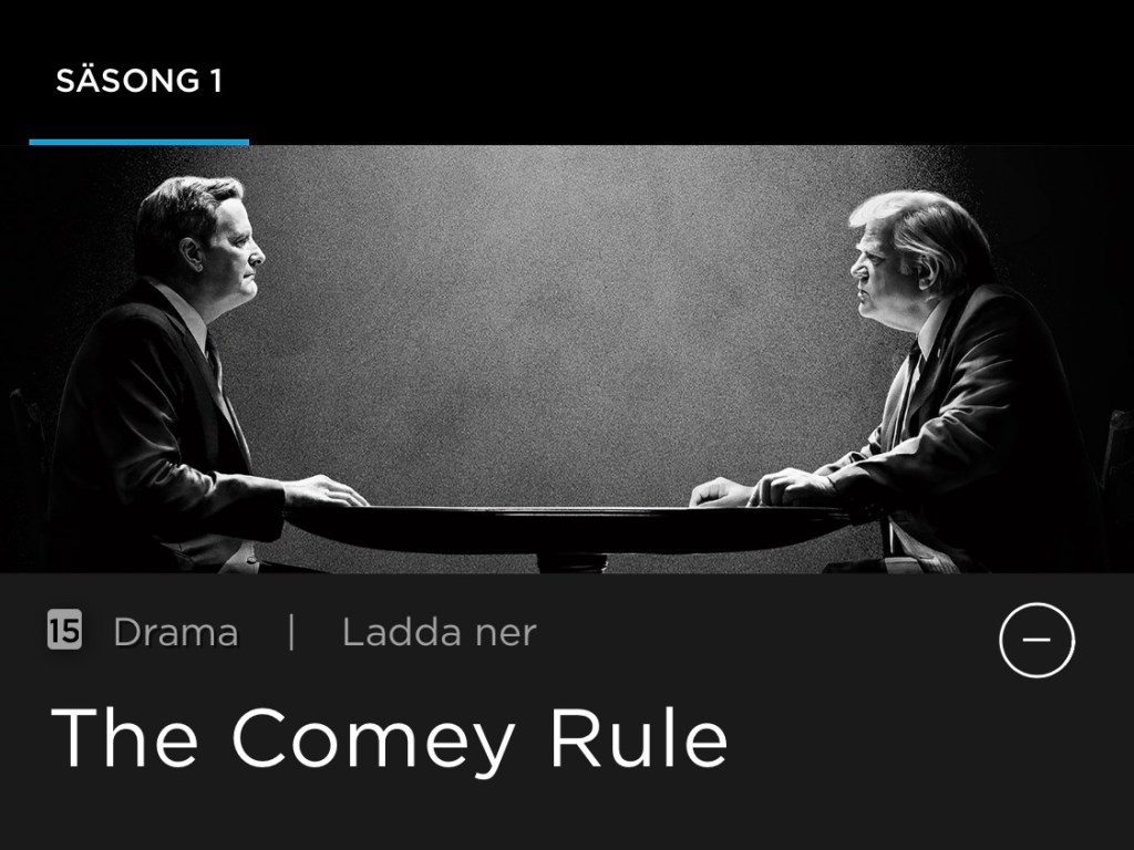 Redan någon gång i somras hörde jag talas om den kommande serien ”The Comey Rule”, om James Comey och debaclet som började med FBI:s undersökning av Hillary Clintons möjligen lagbrytande mejlvanor. Serien är producerad av Showtime och skulle visas i dess strömningstjänst, som inte är tillgänglig i Sverige. Kanske någon av de just nu tre strömningstjänster jag hat abonnemang hos också tar in den, tänkte jag, och började bevaka. Inte ett knyst någonstans. 27 september – premiärdatumet – närmade sig och i mina favoritpoddar om amerikansk politik duggade reklaminslagen om serien tätt, men bara där. ”Vem kan utmana Trump?”, som jag följer på SVT Play, är också en Showtime-produktion, så vem vet, de kanske skulle kunna köpa in ”The Comey Rule” också, tänkte jag, för alla oss USA-politikjunkies. Jag var precis på väg att mejla iväg en ödmjuk förfrågan, men tog först ett dubbelkollande svep och kors i krösamoset, HBO visar serien!