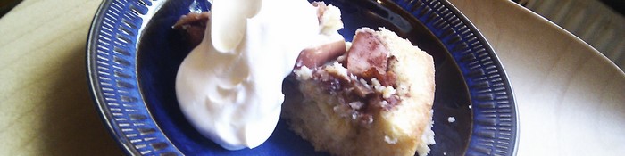 Förresten – den kaka som fortfarande var obakad några blogginlägg ner är den som syns som något oidentifierbart brunmelerat på kakbilden ovan. Hos Therese brukar man bli bjuden på hemodlade grönsaker och annat från Skåne, och jag kunde inte vara sämre, så jag plockade fram äppelklyftor från frysen, som jag skar i höstas när jag fått äpplen från mina föräldrars träd, och bakade en kaka som jag tog med. Men det där fina mönstret som äppelkakan hade på bilden i det recept jag följde förstod jag inte skulle gå att få till med tinade, söliga äppelbitar, så jag bara la dem i en hög rätt på och tryckte till. Ville bara säga det. Be om ursäkt för kakans utseende och framhålla den lokala råvaran.